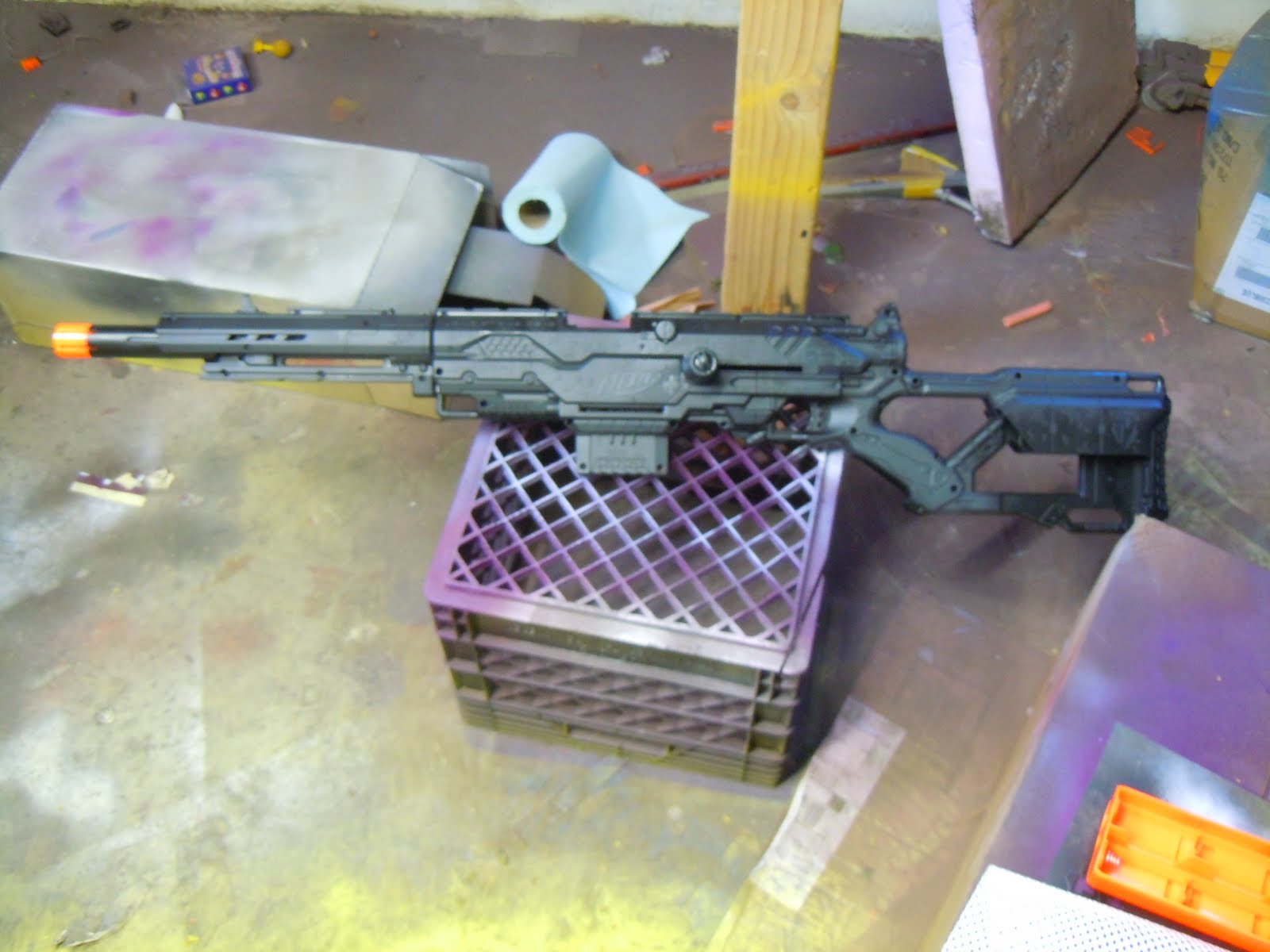 An amazing longstrike, yes amazing. I do not like the longstrike because if it's poor preformance, but with the reverse plunger spring that I have, the distances of the longstrike double. Awesome. Painted matte black, this new sniper rifle can actually function as a rifle. Paired with a vulcan, a great combo for unaicowboy.
