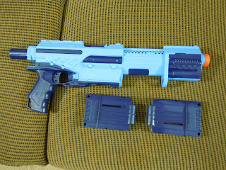 The first clip system barricade that was purchased is also the first blaster to include my signature vinyl stickers. All of the blasters now on will get a Lasagna678 sticker, so it's pretty cool. Internals and raider integration make this thing a beast. A satin black paint job makes this look great, and not like a blue and yellow conglomeration of plastic.